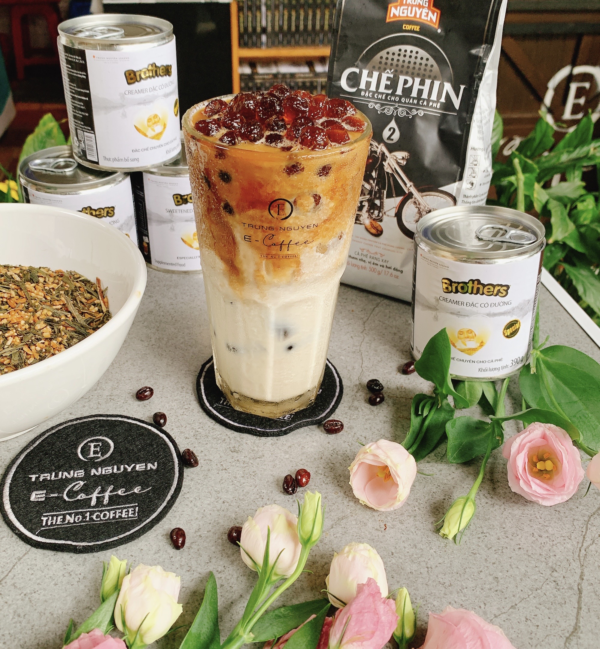 Ngoài ra topping kèm là thạch rau câu làm từ nước cà phê dão sau khi đã lấy đủ lượng cốt cà phê, cùng với thạch trân châu caramel (hoặc trân châu đường đen) sẽ làm cho món nước của trung nguyên chúng ta đến với nhiều thị phần khách hàng hơn nữa, nhất là đối tượng giới trẻ hoặc phụ nữ, không cần thiết phải là nam giới mới yêu thích cà phê trung nguyên!!